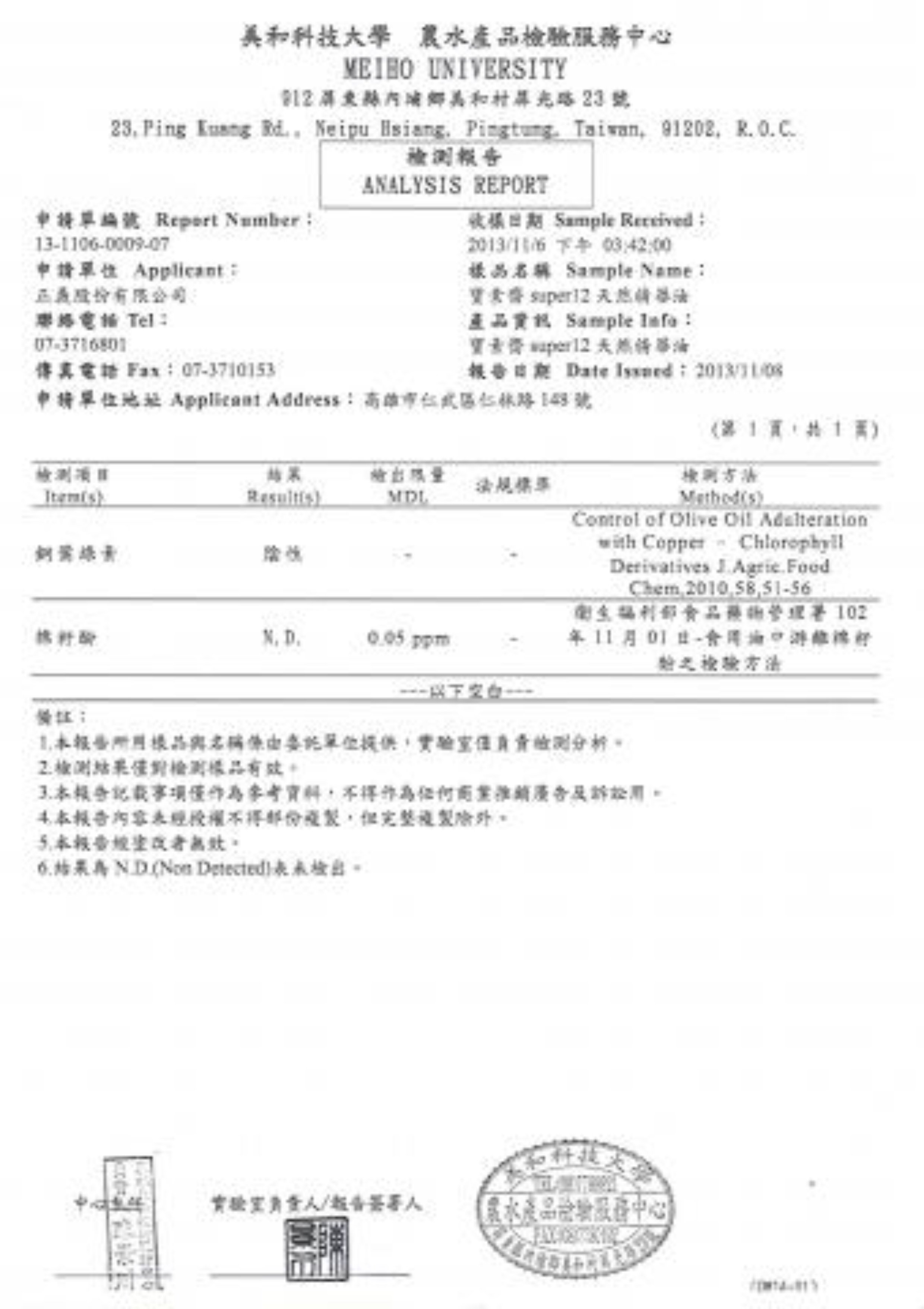 原料131103 美和科技大學 農水產品檢驗服務中心
