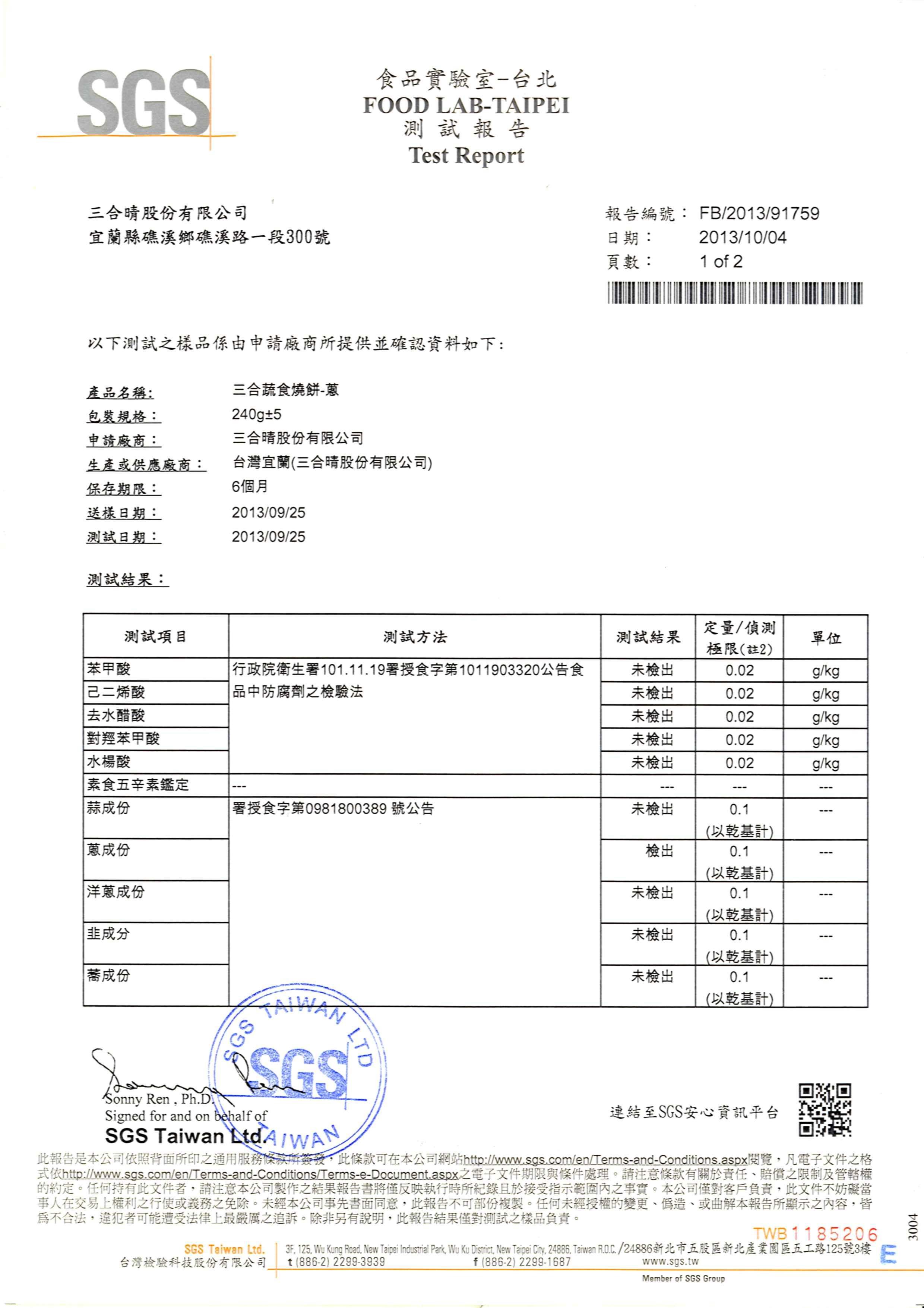 20131004 蔥燒餅 SGS 檢驗報告